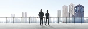 Rear view of two asian business people standing on modern terrace and looking at view